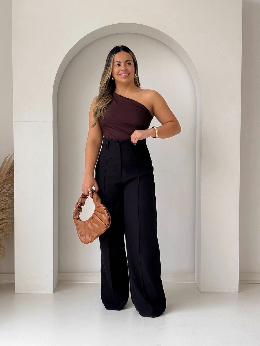 ● Calça com corte pantalona.